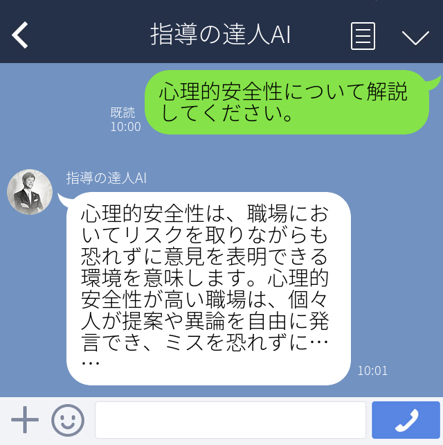 『指導の達人AI』は、LINEで「こんな部下に困ってる」「こういう時の関わり方が分からない」といった相談を入力すると、即座にAIが答えてくれるものです。